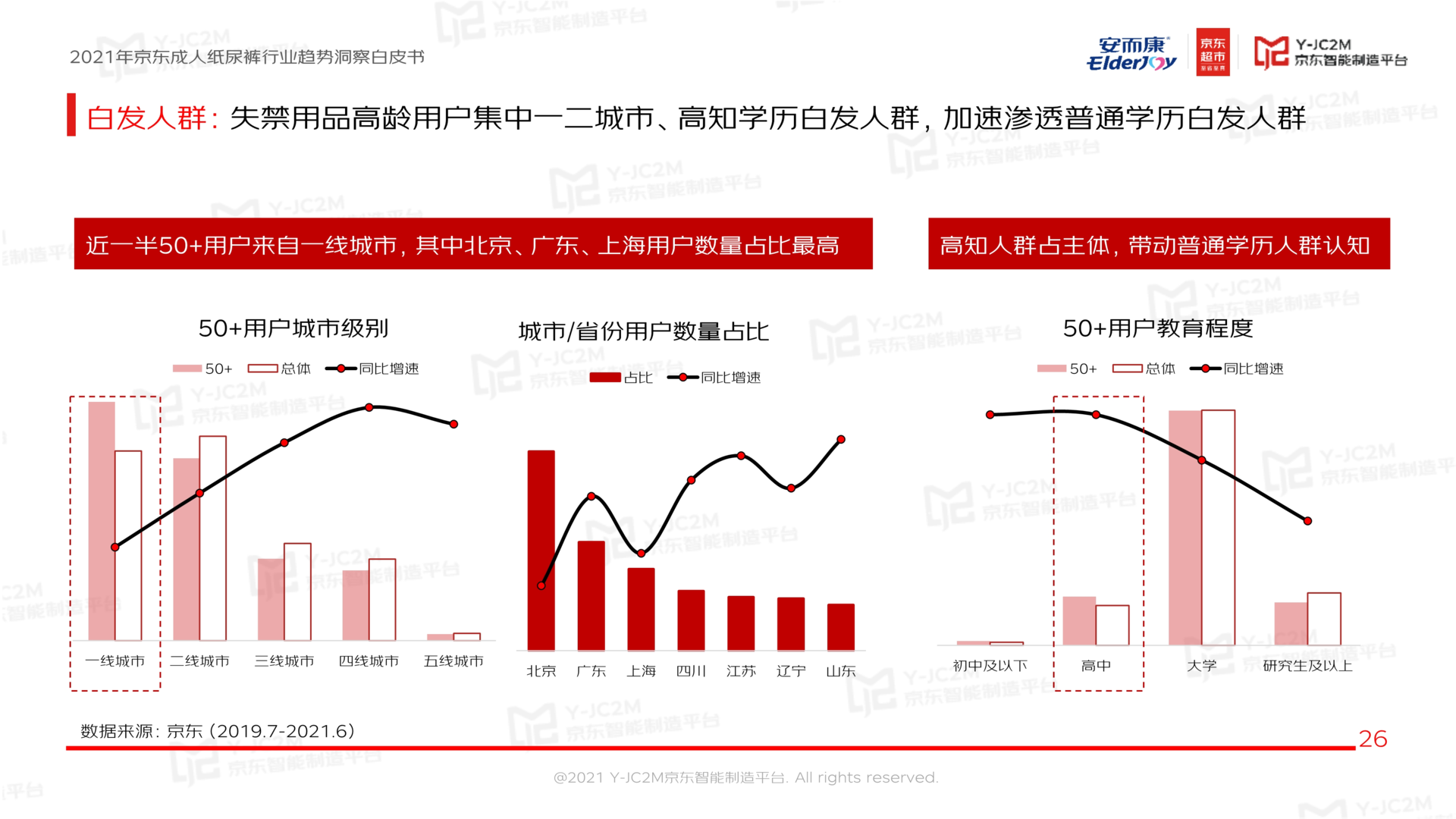 《白皮书》显示,从京东线上失禁用品用户规模来看,消费主力军占比最高的是30-34年龄段人群,同时,40-50+的用户群体亦不容小觑,其占比仅次于第一并且有较高增长率。不仅如此,在老龄化浪潮与国民健康意识不断增强的双重作用下,白发人群的消费力高速提升。尤其是随着网络消费渠道在乡镇消费市场的不断下沉,集中于一、二线城市、高知学历白发人群的失禁用品高龄用户群体,正加速向普通学历白发人群渗透。
