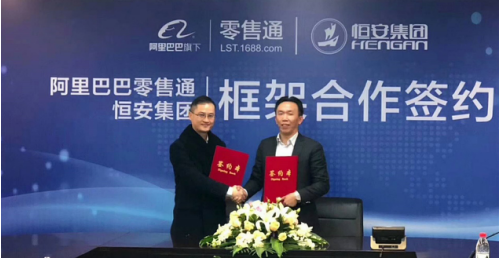 阿里巴巴集团副总裁、零售通事业部总经理林小海(左)与球速体育集团运营中心总裁许水深(右)签订战略合作协议